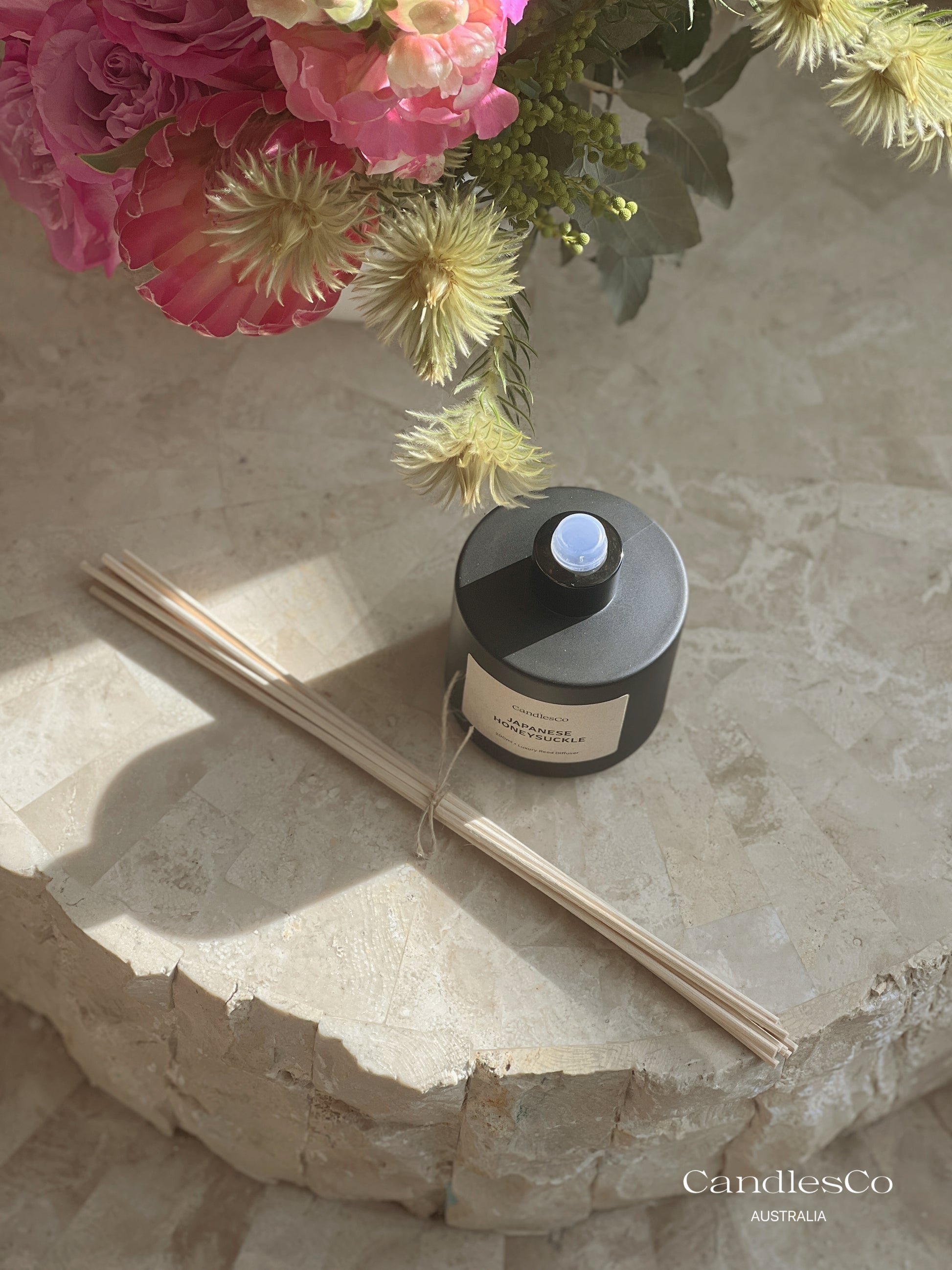 CandlesCo Reed Diffusers are made with premium scents, diffuser base and fibre sticks to give an amazing and prolonged scent throw. If you find it a little too strong or are using in a smaller room, we recommend to use less reeds.