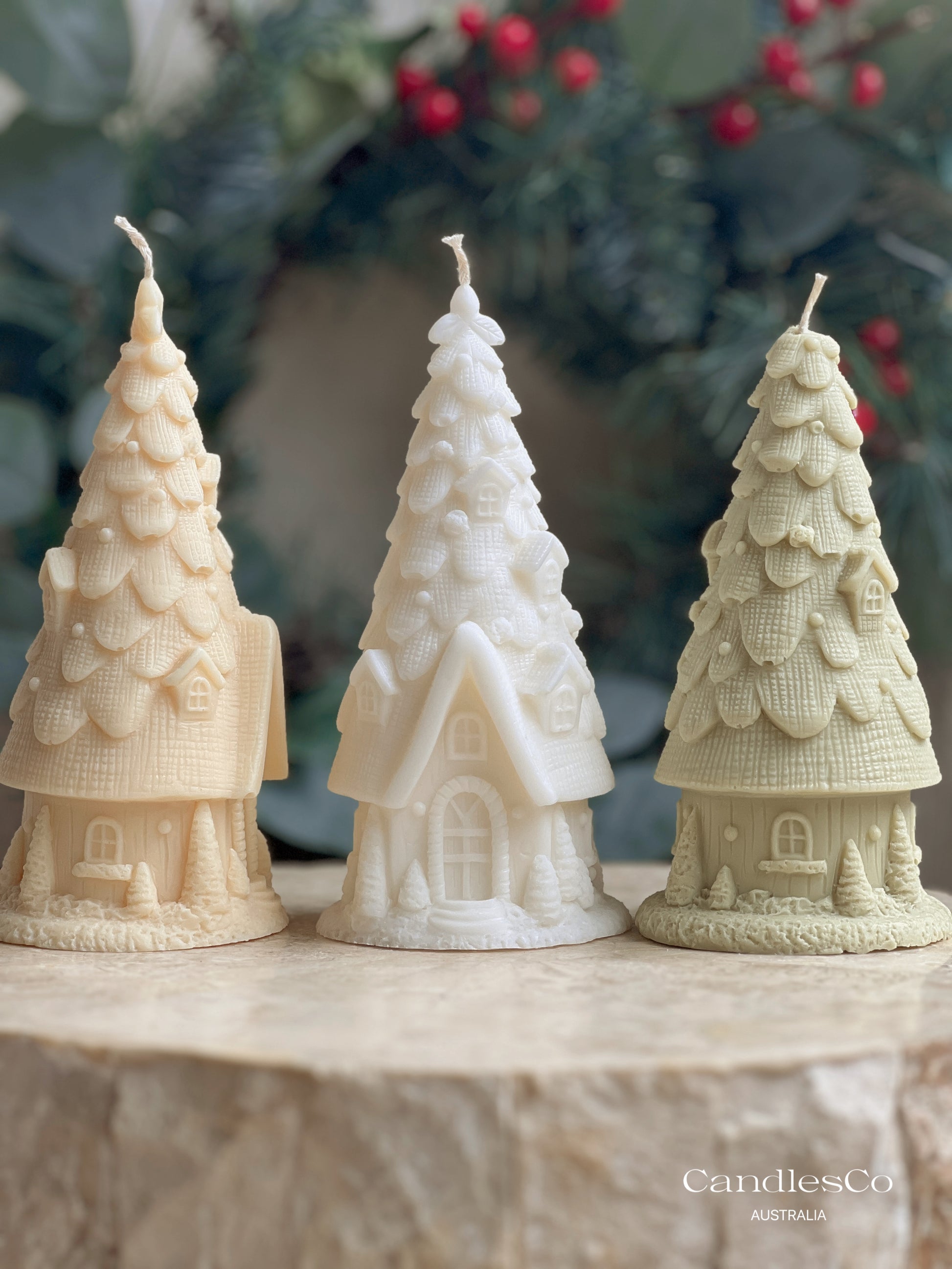 Handcrafted from 100% natural soy wax, each piece features intricate details of a snow-covered cottage surrounded by evergreens — evoking the cozy charm of a winter wonderland.
